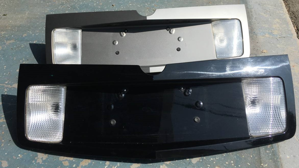 The first two years of the CTS came with a hard plastic tinted panel around the rear license plate and backup lights. This panel is notorious for breaking and/or falling off. So much so that Cadillac changed the design in 2005. If your original rear panel is letting down the look of your car, it can be replaced with the new style as shown in the pic. (They are removed from salvaged cars and polished.)
